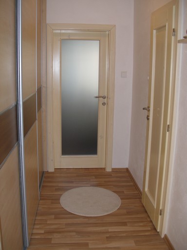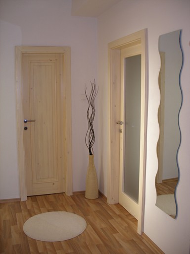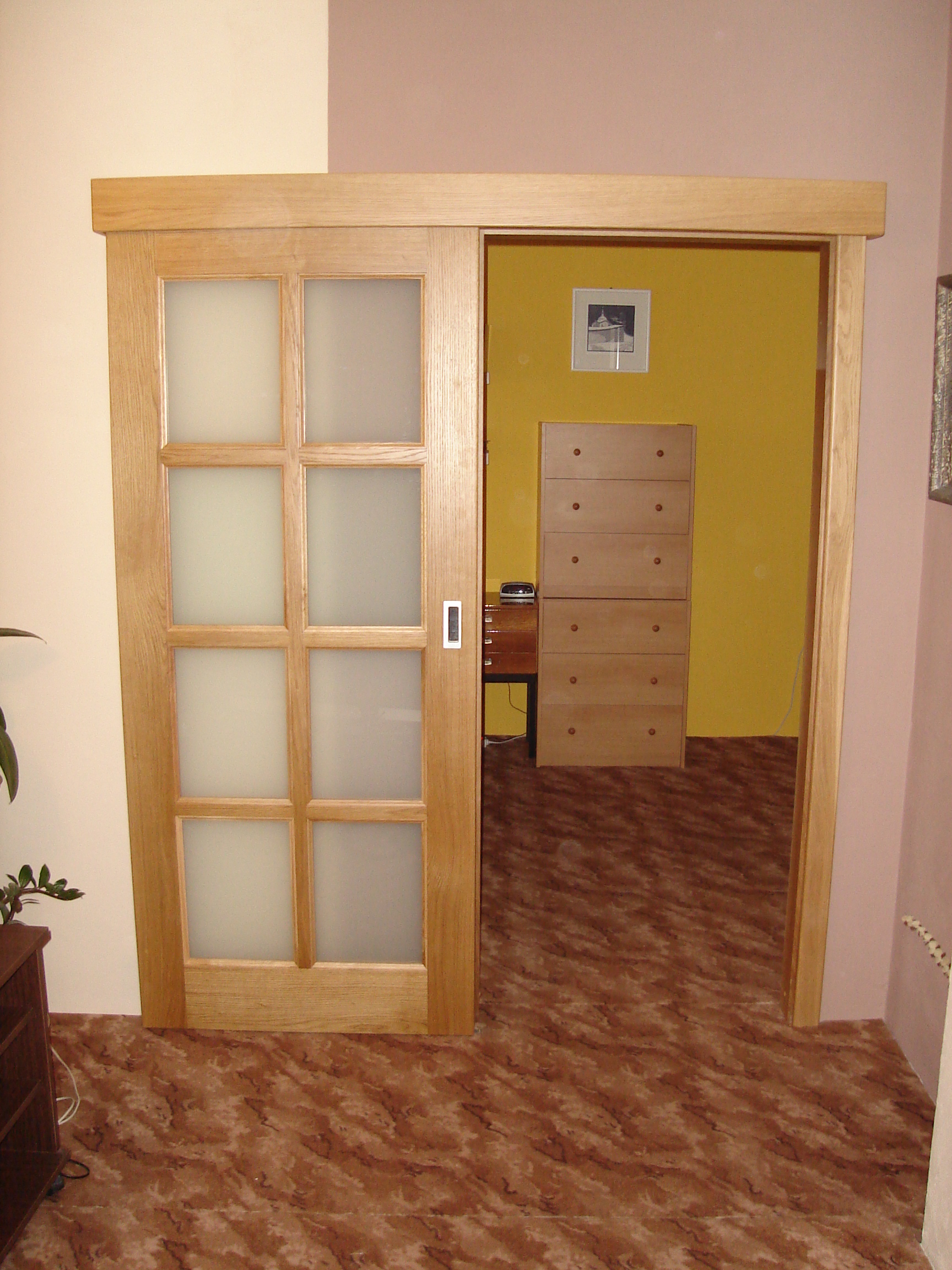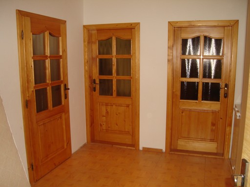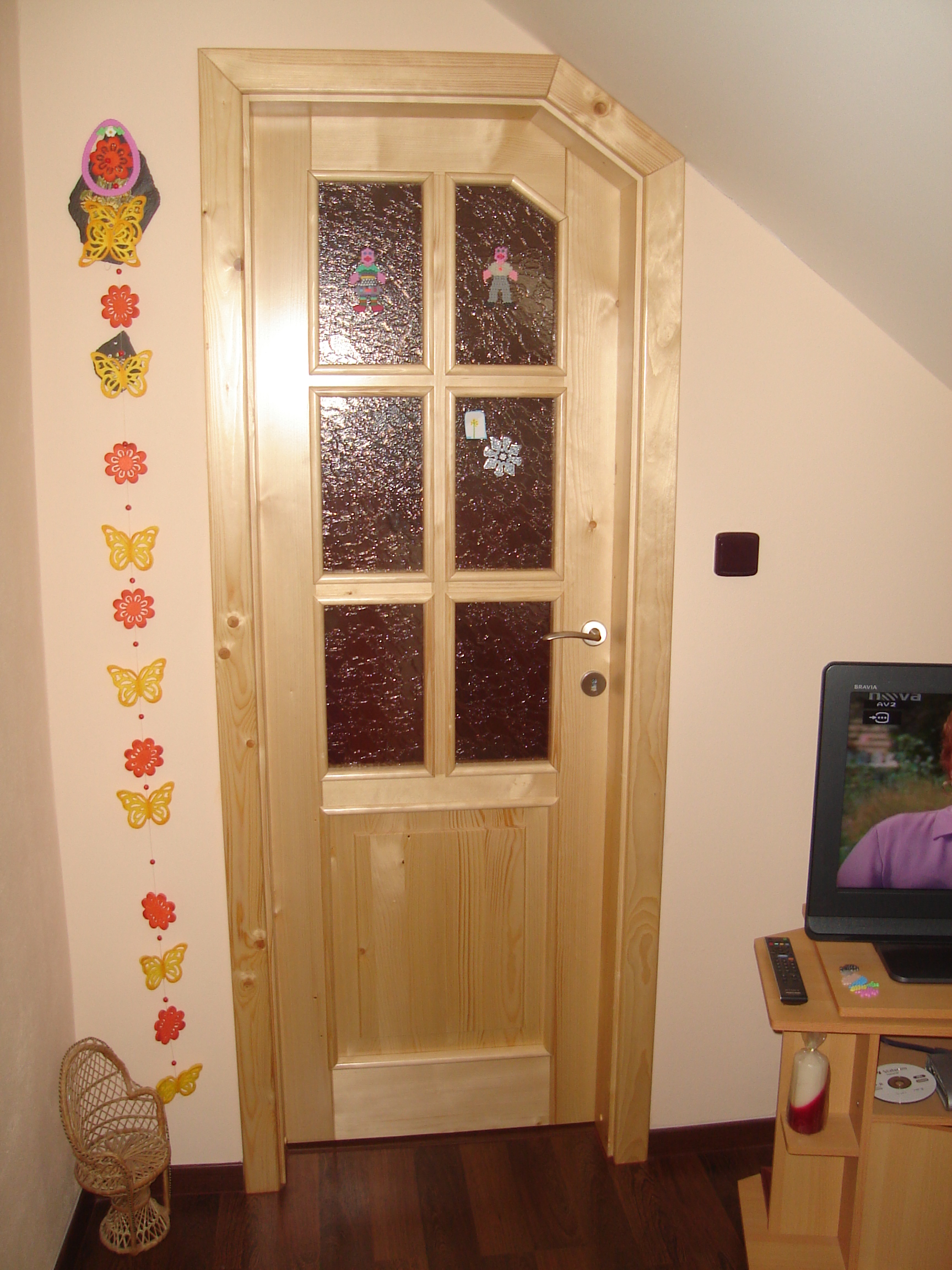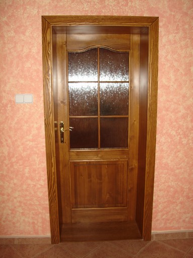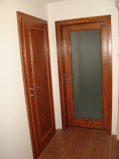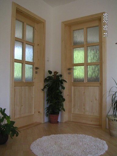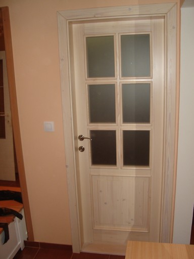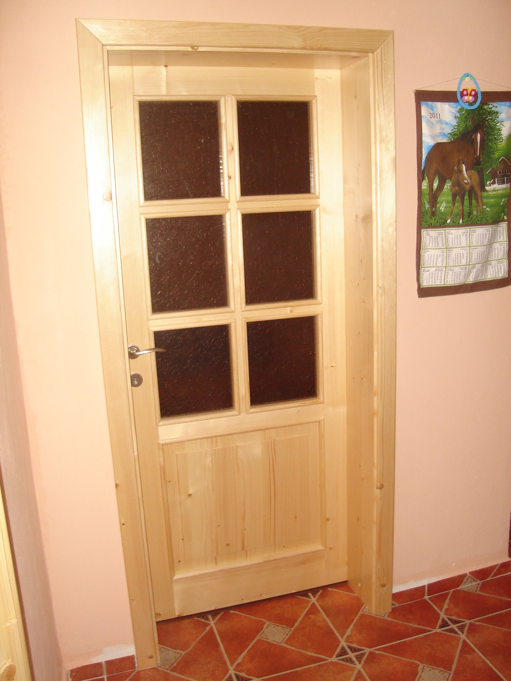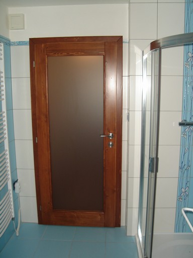 Smrkové dveře, mořené odstín sipo, sklo satinato